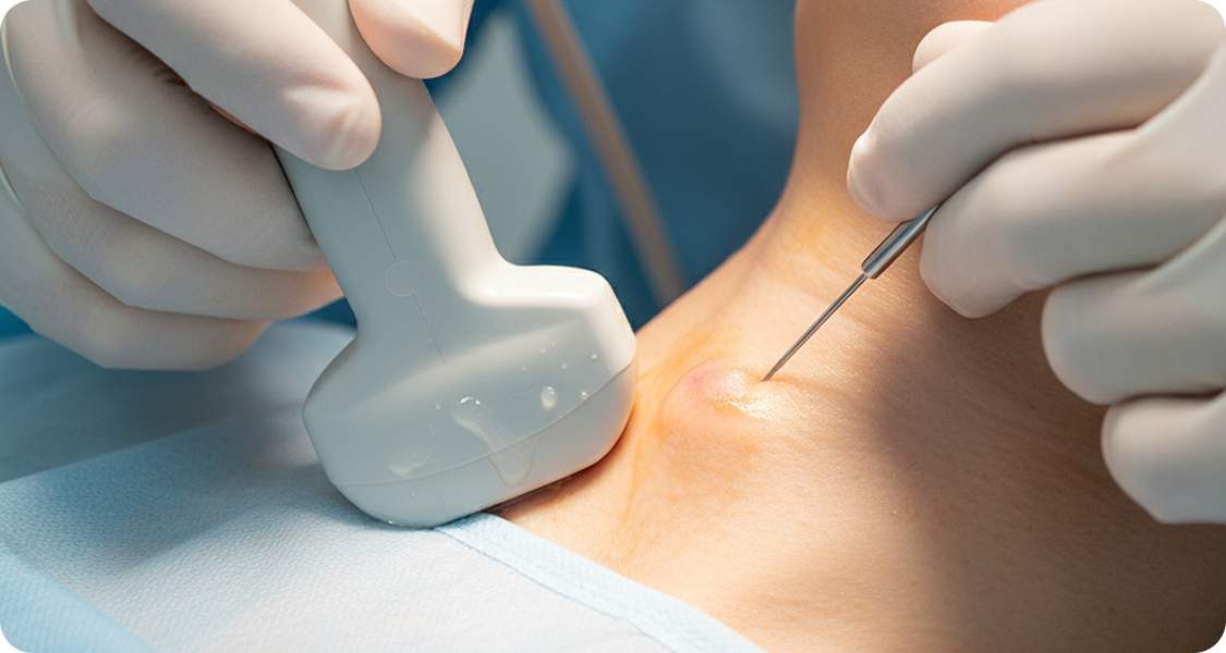 초음파로 결절 위치를 확인하고 피부를 소독한 후 국소마취를 시행합니다.